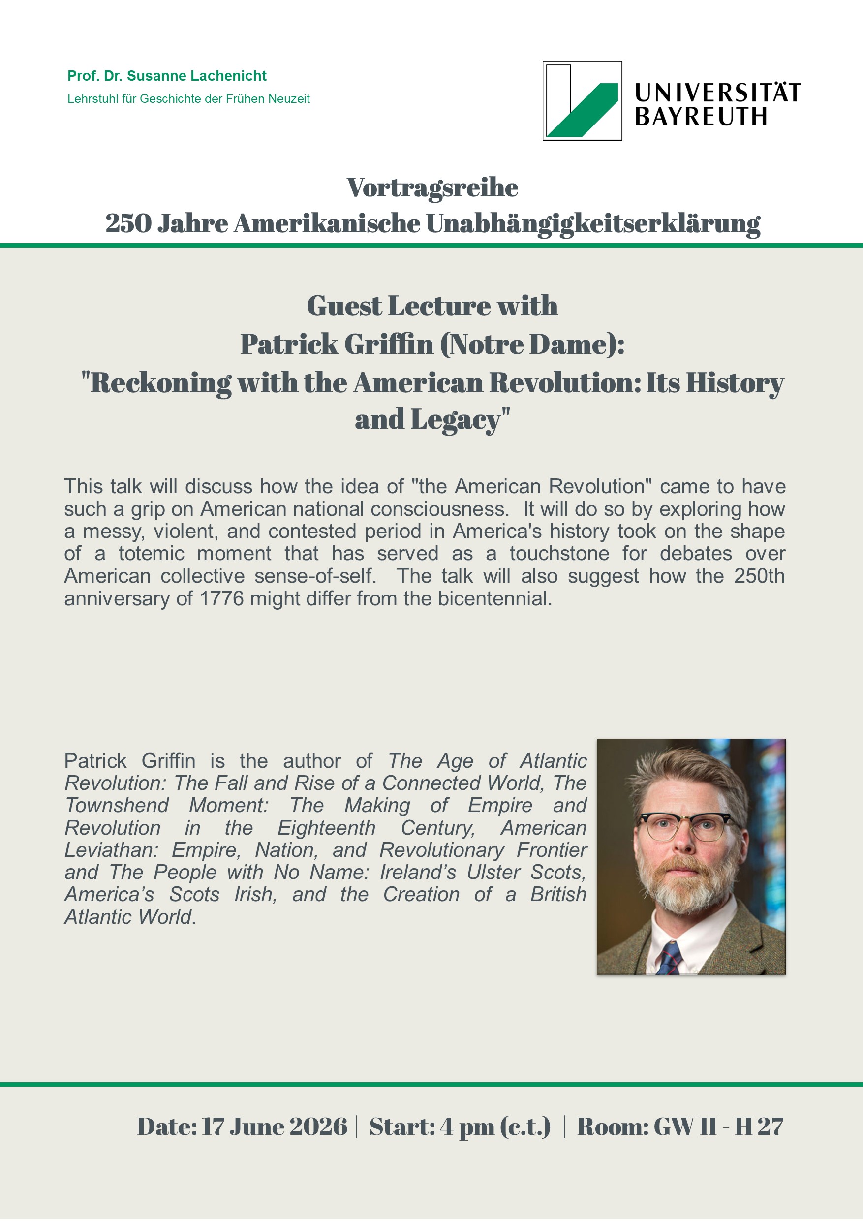 Guest Lecture by Patrick Griffin (Notre Dame): “Reckoning with the American Revolution: Its History and Legacy” on 17 June 2026 in H 27 (GW II)